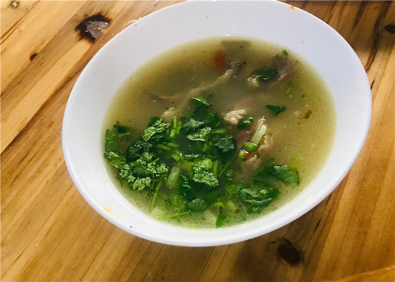為啥是神級料理?第一,作為冬至節(jié)的特供菜,一年只出現(xiàn)一次,錯過不知明年還有沒有。第二,選材用料絕對是上等,比起小關(guān)廟那80塊錢的羊肉湯,絕對物超所值。主料羊肉,精選上等現(xiàn)殺小麻羊,李叔叔以絕對精湛的刀工,庖丁解羊,羊肉片的厚薄一致,保持了肉質(zhì)的鮮嫩。早上五點,項目部食堂的鍋就咕嚕咕嚕地冒著熱氣,上面燉著由鯽魚和豬骨熬制的高湯,呈現(xiàn)了點點淡黃,濃郁的湯底,鮮味不斷地冒出來,讓人口水直流。羊肉下鍋煮之前要經(jīng)過好幾道工序:清洗、碼料、汆水、炒制。每個過程都精細無比,被肖阿姨譽為獨家秘方。羊肉的膻味是什么?在這鍋湯里面絕對找不到一點點,里面有紅棗、枸杞的甜,有鯽魚、豬骨和肉的鮮。湯要好湯,但是蘸水也不可小覷。小米辣、香菜、青椒、豆腐乳加點干海椒面兌的蘸碟,在碟里面打個滾,每一口鮮都能咬掉舌頭。