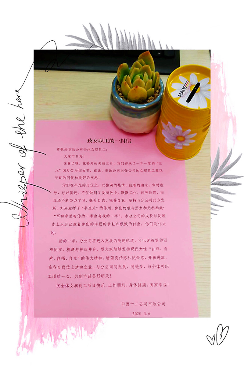 當(dāng)大家進(jìn)入辦公室,就看見(jiàn)擺放在桌上的一封致市政公司女職工的信和綠植小禮物。下午,所有女職員工回家準(zhǔn)備自己的廚藝參賽作品,將烹飪過(guò)程及成品用圖片配文字的形式展示在工作群中,參賽作品有糖醋排骨、紅燒兔、冬陰功火鍋、蘆筍彩椒炒紅腸等,經(jīng)過(guò)激烈緊張的投票,最終一道名為春江水暖的美食拼盤(pán)以濃厚的藝術(shù)氣息摘得桂冠。