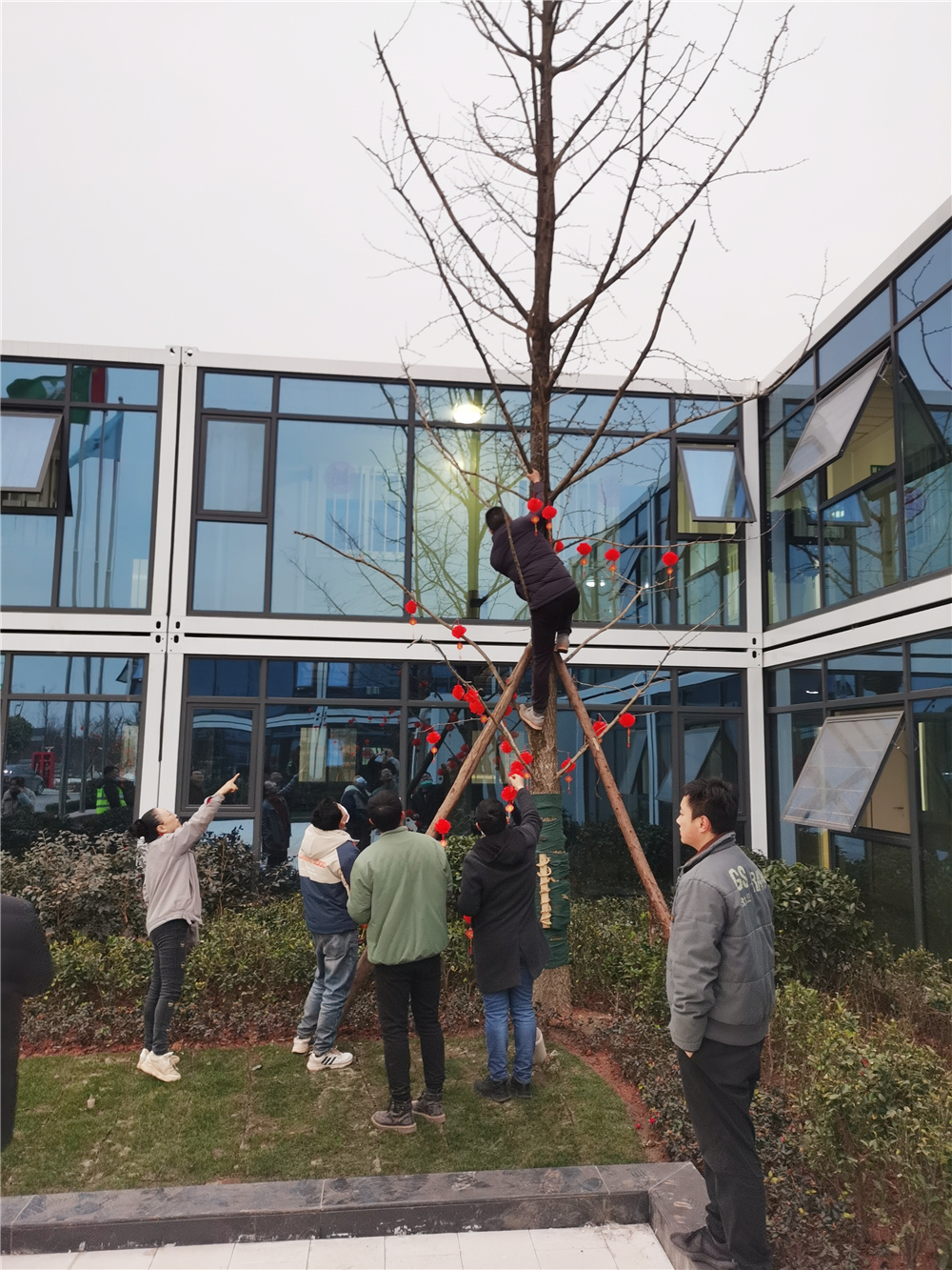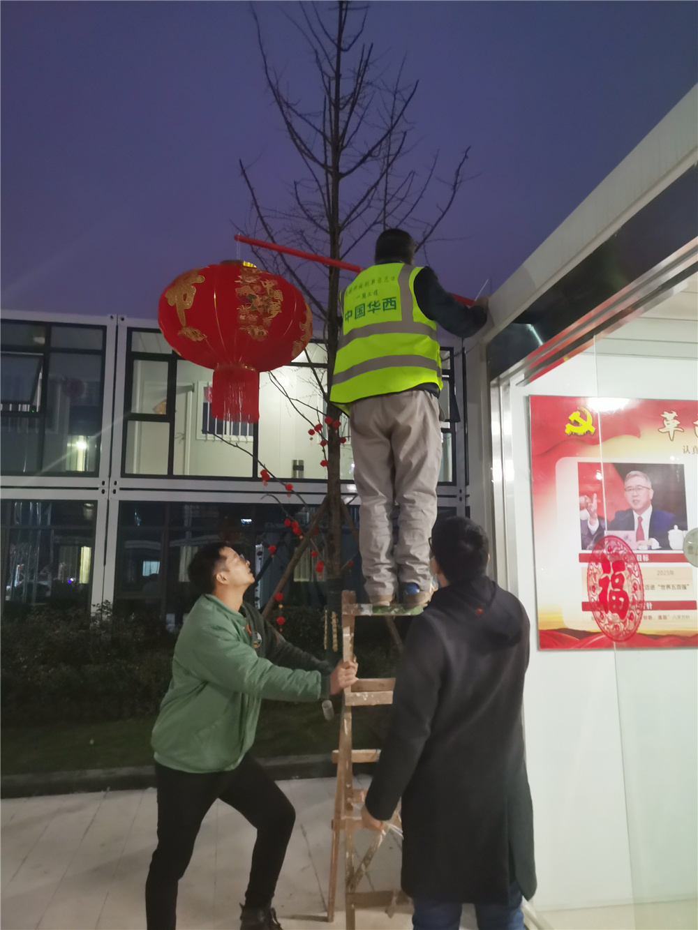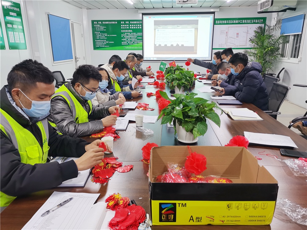 在項目書記潘仲媛的帶領下,項目部管理人員在會議室完成春聯(lián)與燈籠制作,隨后大家齊心協(xié)力將一盞盞紅彤彤的燈籠,一副副紅艷艷的春聯(lián)懸掛起來,將整個項目部裝點得溫暖、祥和,處處洋溢著濃濃的節(jié)日氛圍。紅燦燦的燈籠映照出濃郁的喜慶,紅艷艷的春聯(lián)透露出由衷的祝福,高高掛起的紅燈籠及金閃閃的滿天星,寄語項目全體工友和管理人員在2021年幸福安康、團圓美滿。同時也鼓勵著全體管理人員及工友,革故鼎新,繼往開來,為實現(xiàn)“千億華西”和邁進“世界五百強”而努力奮斗。