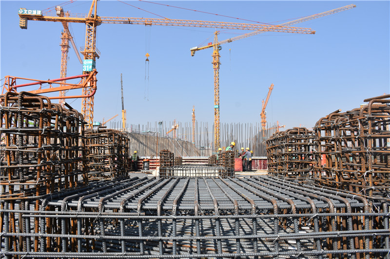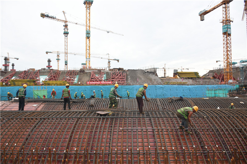 由于現(xiàn)場場地狹窄,大鐵的混凝土澆筑量大,側(cè)墻、頂板均為大體積混凝土,項(xiàng)目技術(shù)團(tuán)隊(duì)對墻體支模、頂板支模方案進(jìn)行了反復(fù)研究并通過了專家論證。大鐵外墻厚達(dá)2米至3米,高度8.5米,頂板厚度達(dá)2.5米至3米,支模高度9.95米至12.25米,且是弧形拱板,框架梁高度也達(dá)3.92米至6.25米。面對如此厚度與高度的側(cè)墻與頂板,且均是Φ36、Φ40等大直徑鋼筋的綁扎,項(xiàng)目技術(shù)團(tuán)隊(duì)對施工方法進(jìn)行了專門研究討論,經(jīng)過與設(shè)計單位溝通優(yōu)化設(shè)計,從鋼筋定制、采購、制作、綁扎及施工步驟進(jìn)行改良,為大鐵的首段混凝土順利澆筑奠定基礎(chǔ)。頂板采用疊合澆筑