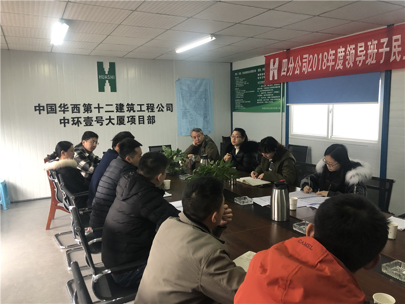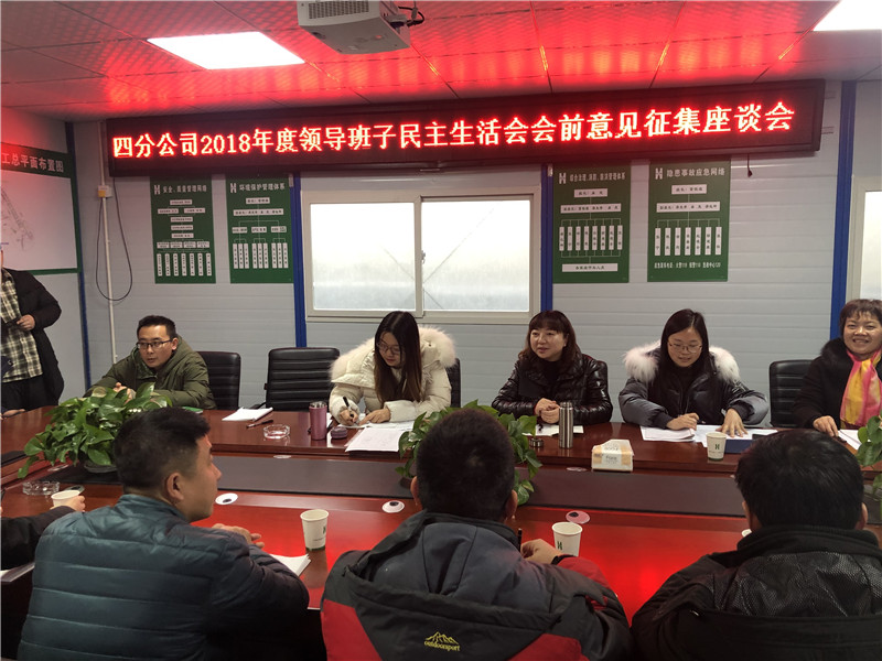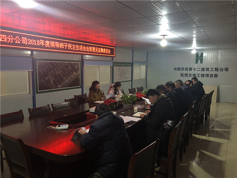 為認(rèn)真召開(kāi)分公司2018年度領(lǐng)導(dǎo)班子民主生活會(huì),提升民主生活會(huì)質(zhì)量,四分公司黨總支書(shū)記陳怡帶隊(duì)深入施工一線,分別組織了職工代表在雅安凱悅天地項(xiàng)目部、中環(huán)壹號(hào)大廈項(xiàng)目部、百悅星城項(xiàng)目部召開(kāi)了職工座談會(huì),認(rèn)真聽(tīng)取了與會(huì)人員對(duì)分公司領(lǐng)導(dǎo)班子及個(gè)人提出的意見(jiàn)和建議。