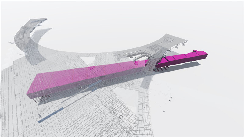由于大鐵區(qū)域上方為中央大廳,是整個(gè)T2航站樓的核心區(qū)域,需要減少飛機(jī)和高鐵運(yùn)行之間的沖突。通過(guò)180余個(gè)減振基礎(chǔ)將D大廳14余萬(wàn)噸結(jié)構(gòu)荷載傳至大鐵弧形頂板上,能緩沖鐵路高速運(yùn)行帶給上部結(jié)構(gòu)及飛機(jī)起降對(duì)鐵路安全運(yùn)行的振動(dòng)影響。為達(dá)到預(yù)期效果,項(xiàng)目部利用BIM三維可視化模型對(duì)施工中的關(guān)鍵節(jié)點(diǎn)進(jìn)行施工模擬和構(gòu)建預(yù)安裝,并通過(guò)模擬和動(dòng)畫的形式配合技術(shù)方案進(jìn)行施工前的技術(shù)交底。施工過(guò)程中,現(xiàn)場(chǎng)工作人員對(duì)各道工序質(zhì)量嚴(yán)格要求,從限位臺(tái)鋼筋的預(yù)埋到模板的安裝再到混凝土的澆筑,從隔振器的定位到吊裝就位再到上部承臺(tái)的施工,精確控制減振支座的澆筑成型、反復(fù)核查減振器定位安裝、動(dòng)態(tài)監(jiān)控承臺(tái)施工時(shí)底面平整度的變化,確保結(jié)構(gòu)的安全穩(wěn)定。