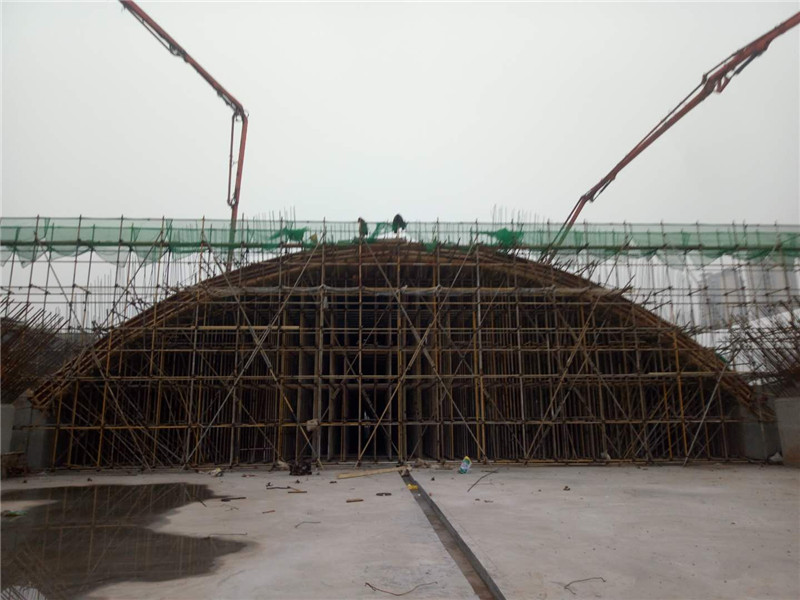 文化公園上跨橋是天府仁壽大道城區(qū)段項目的控制性工程,是提升全縣宜居生活品質(zhì)、展示仁壽對外形象的文化景觀橋。該橋全長158米,寬80米,主橋采用上承式實腹式連拱結(jié)構(gòu),孔跨布置為26米+28米+30米+28米+26米,共5跨,每跨橫向被2米的透光帶分為四塊,將整個橋梁空跨劃分為20個板塊。主拱圈為0.7米等厚度的圓弧形板拱結(jié)構(gòu),支模體系最大搭設(shè)高度為8.4米,最大搭設(shè)跨度為30米,面荷載達26.4KN/㎡,混凝土澆筑量達8700余立方米。針對拱圈板塊多、支模架搭設(shè)要求高、混凝土量大等情況,項目部多次組織專題會議研究討論專項方案,進而形成了最終的實施方案,并順利通過專家組論證。