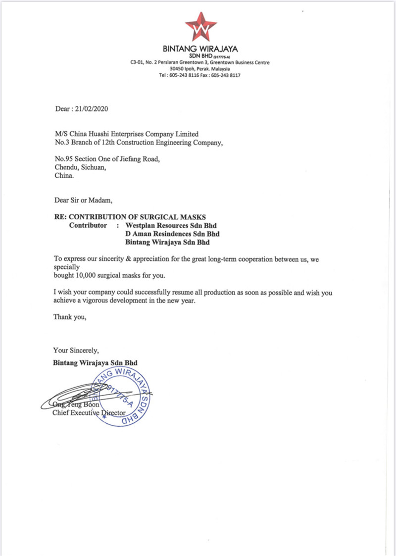 歲末年初,一場(chǎng)突如其來的疫情席卷中國(guó)大地。十二公司馬來西亞怡保迪阿曼項(xiàng)目的業(yè)主,為感謝雙方兩年多來良好的合作,也為了感謝華西在疫情期間為社會(huì)做出的貢獻(xiàn),特地購買了10000只口罩捐贈(zèng)給公司,并真誠希望公司在做好防疫抗疫工作的同時(shí),盡快恢復(fù)各項(xiàng)生產(chǎn),在新的一年取得耀眼的成績(jī)。捐贈(zèng)信上短短的幾行字,言簡(jiǎn)而情深,承載的是業(yè)主對(duì)我們工作的認(rèn)可和共度難關(guān)的深刻情誼。這批口罩日前已由馬來西亞聯(lián)合黨支部書記杞鄖同志親自“護(hù)送”回國(guó),于2月23日下午送抵公司。下一步將由公司統(tǒng)籌安排,主要用于保障重點(diǎn)項(xiàng)目的復(fù)工復(fù)產(chǎn)需要。
