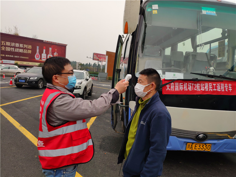 為了保障返蓉工人的安全健康,項目部對返程人員提前做好摸底排查,登記造冊,形成人員動態(tài)臺賬,預防疫情擴散風險。發(fā)車前,對專車內(nèi)外進行了消毒,所有人員返程前須持有健康通行卡并測溫合格后上車,同時每輛車均配有1名管理人員全程護航。