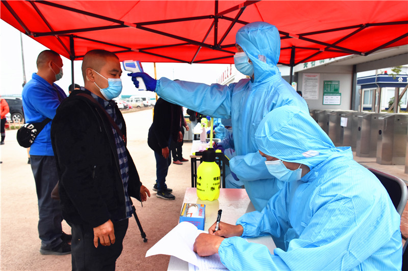 專車于27日下午3時抵達項目工人生活區(qū),返蓉工人依次排隊下車接受體溫監(jiān)測,前往一側(cè)的體溫登記處進行手部消毒,領(lǐng)取體溫正??ǎ俳?jīng)全身消毒后進入生活區(qū)。返蓉工人還需提供身份證等資料進行實名登記,填寫防疫承諾書,接受入場防疫知識專項教育、三級安全教育交底。明天他們將進入作業(yè)區(qū),對T2航站樓砌體進行施工。