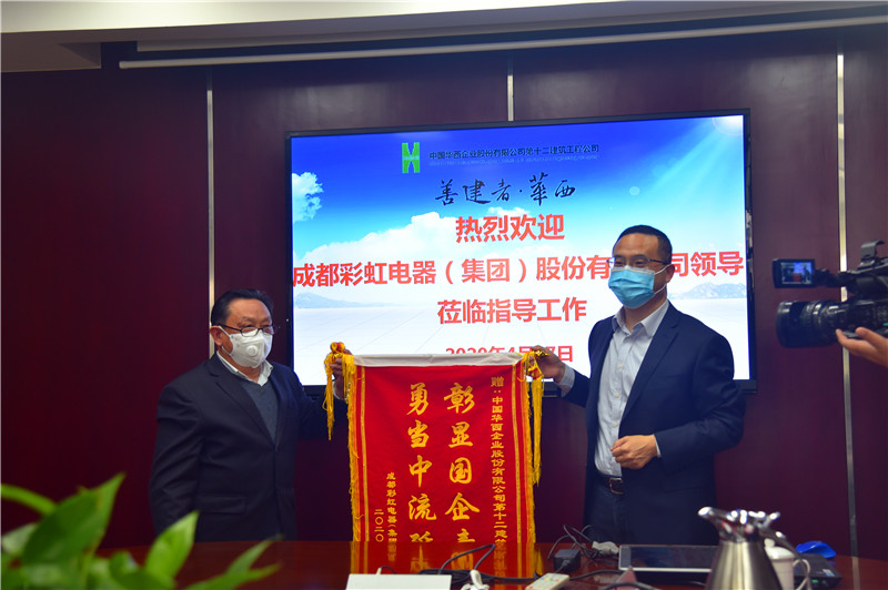 在年初新冠肺炎疫情爆發(fā)后,十二公司臨危受命,緊急承接了成都彩虹集團(tuán)防疫物資應(yīng)急工程,兩家企業(yè)一起攜手防疫抗疫,共同保衛(wèi)人民的生命安全。為了感謝公司在此次緊急工程任務(wù)中的責(zé)任擔(dān)當(dāng)和積極貢獻(xiàn),4月17日,成都彩虹電器(集團(tuán))股份有限公司黨委書記、董事長劉榮富一行蒞臨公司,向十二公司贈送了“彰顯國企責(zé)任 勇當(dāng)中流砥柱”的錦旗。公司黨委書記朱軍、常務(wù)副總經(jīng)理吳偉、副總經(jīng)理胡銳以及相關(guān)部門負(fù)責(zé)人參加贈旗儀式。
