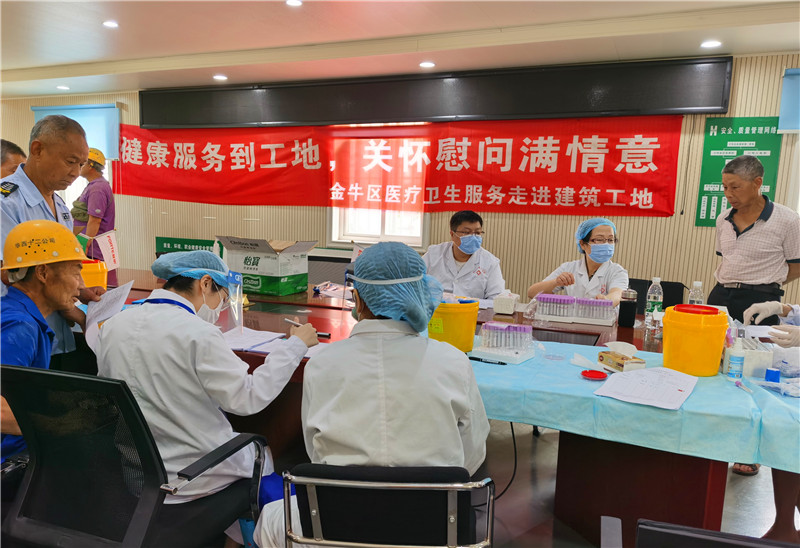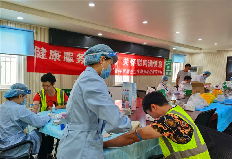 當(dāng)前,我國疫情防控階段性成效進一步鞏固,復(fù)工復(fù)產(chǎn)取得重要進展,經(jīng)濟社會運行秩序加快恢復(fù)。復(fù)工復(fù)產(chǎn)效率提高的同時,勞務(wù)工人們也重新投入到緊張而繁忙的現(xiàn)場中,搶時間,趕進度,補回損失,確保項目順利推進。在常態(tài)化疫情防控的當(dāng)下,確保農(nóng)民工健康平安也是確保工程質(zhì)量的關(guān)鍵,為保證勞務(wù)工人的安全和健康,創(chuàng)造良好工作環(huán)境。近日,三分公司復(fù)地天府灣項目部邀請金牛區(qū)疾病防控中心聯(lián)合建筑醫(yī)院,走進項目部,開展勞務(wù)工人義務(wù)體檢活動。
