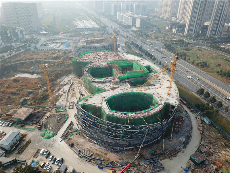 施工中的天府新區(qū)省級文化中心的演藝中心形狀就像一雙貓耳朵,它的輪廓如此清晰,但卻少了點(diǎn)貓耳朵本應(yīng)該有的生動感。由設(shè)備租賃公司承建的“天府新區(qū)省級文化中心施工二標(biāo)段鋼結(jié)構(gòu)專業(yè)工程”就是來補(bǔ)足它的靈動。項目團(tuán)隊用大小各異且曲度不同的管件,用形狀迥異的支座,形成了“自下而上的螺旋曲線、向內(nèi)向外的傾覆線條和或?qū)捇蛘牟ɡ思y理”,再將這雙長160m,寬105m的耳朵漸漸包裹,最后的整體形象好似它躲著即將走近的你,滿滿的羞澀感,十足的乖巧。
