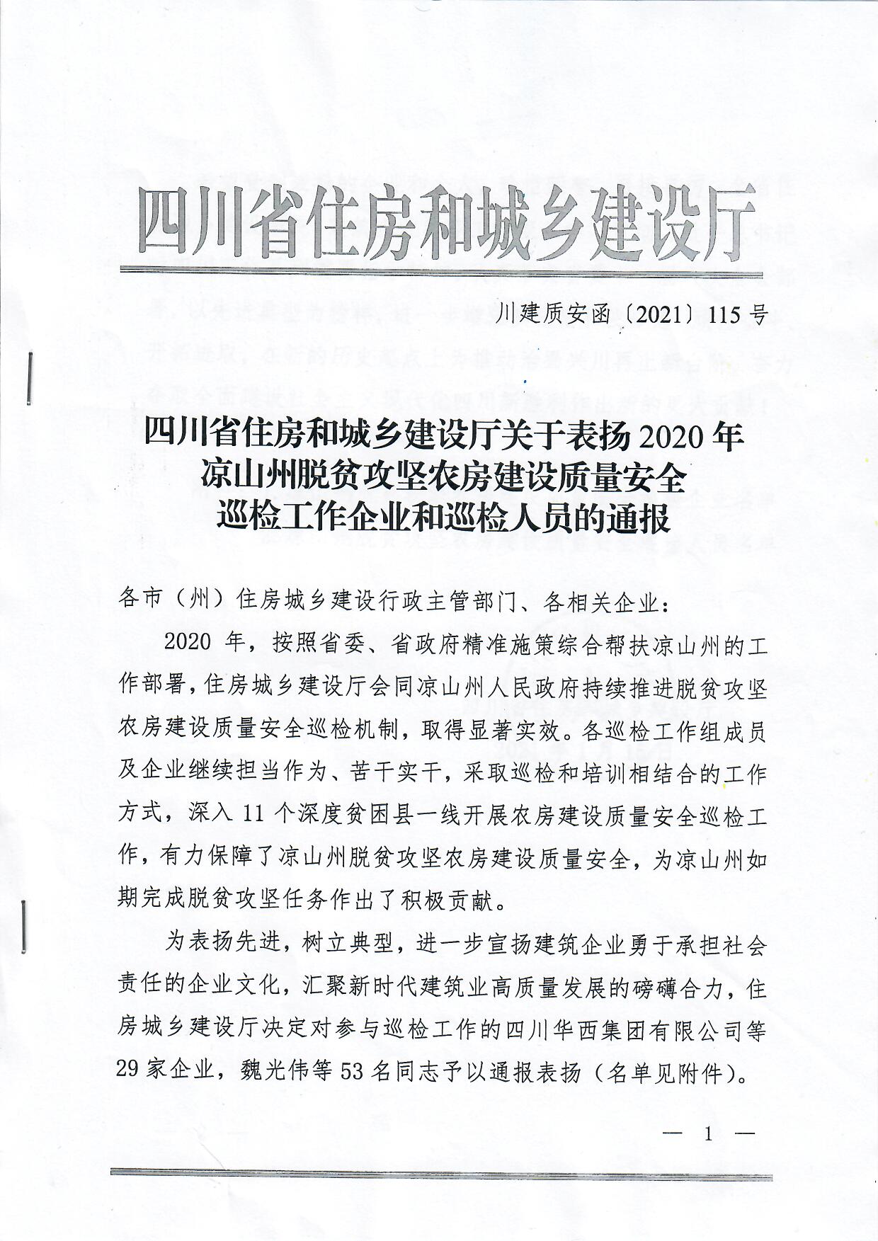 近日,為了表?yè)P(yáng)先進(jìn),樹立典型,進(jìn)一步宣揚(yáng)建筑企業(yè)勇于承擔(dān)社會(huì)責(zé)任的企業(yè)文化,匯聚新時(shí)代建筑業(yè)高質(zhì)量發(fā)展的磅礴合力,四川省住建廳向參與了涼山州脫貧攻堅(jiān)農(nóng)房建設(shè)質(zhì)量安全巡檢工作的企業(yè)和人員予以通報(bào)表?yè)P(yáng),表?yè)P(yáng)名單中包括中國(guó)華西企業(yè)股份有限公司及華西十二公司職工魏光偉、馬德勇。