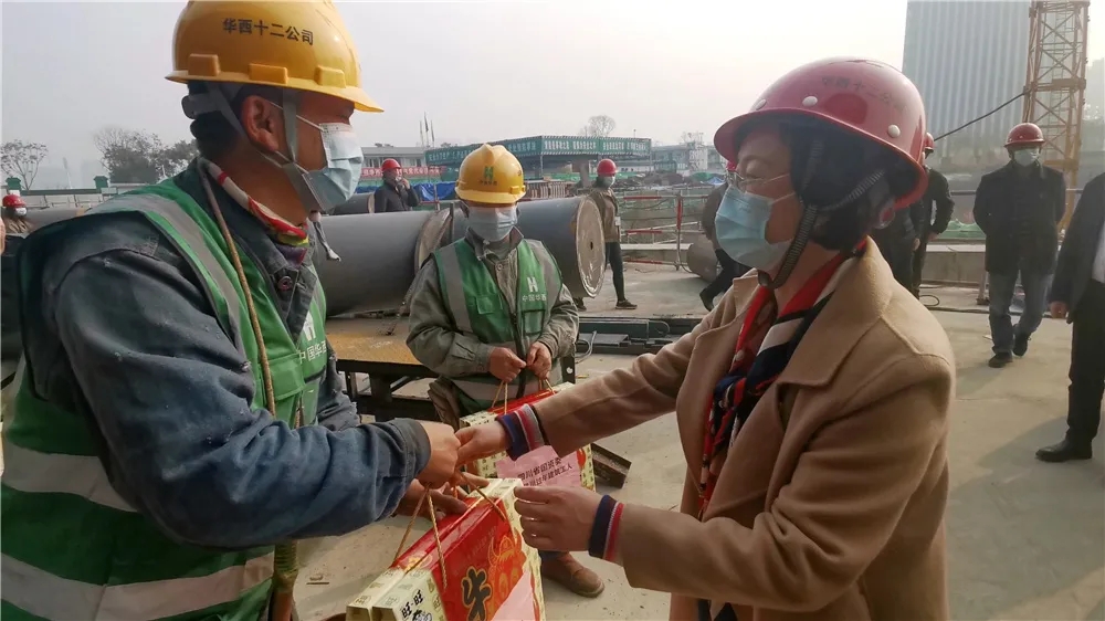 聽取匯報后,游代麗對項目部各項工作表示了充分肯定,向在場的項目管理人員道上一聲辛苦,并致以節(jié)日的祝福。游代麗強調(diào),項目部要堅決貫徹“安全”二字,牢固樹立“以人為本、安全發(fā)展”的理念,做到防疫工作不松懈,安全生產(chǎn)不停歇,日常工作精細化,確保項目在施工周期中的平穩(wěn)運行。最后,游代麗代表國資委黨委向留蓉過年的農(nóng)民工發(fā)放了慰問物資并送上誠摯的新年祝福。