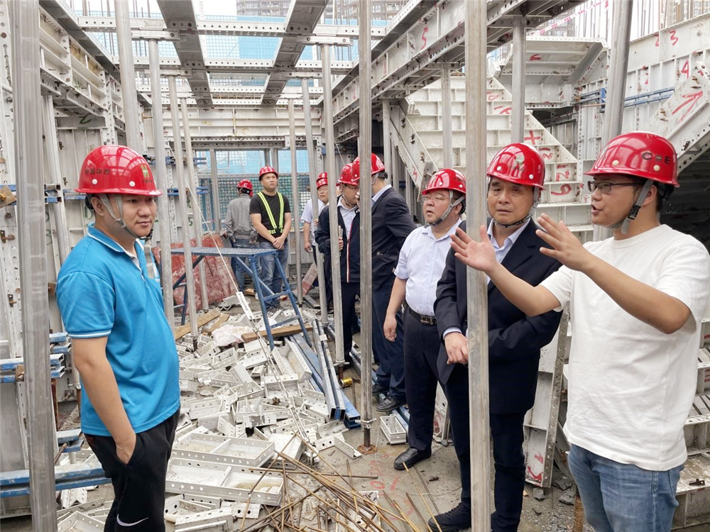次日,學習考察團實地參觀了中華西市政工程公司深圳萬科啟城項目的機械設備、辦公箱房、安全防護標準化設施、鋁模、盤扣架、鋼+鋁復合型整體提升架的應用情況。