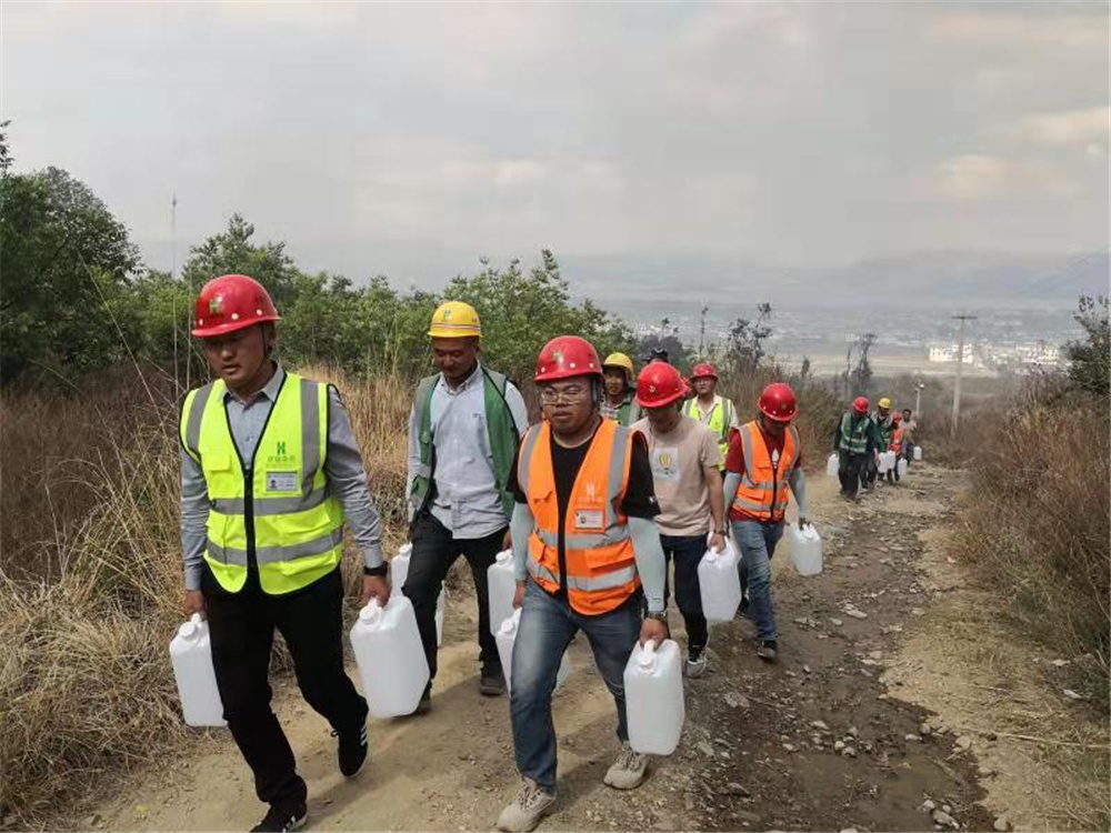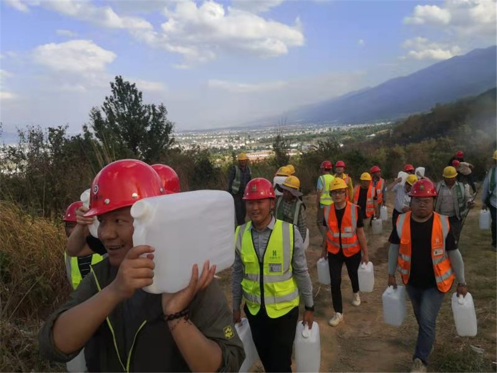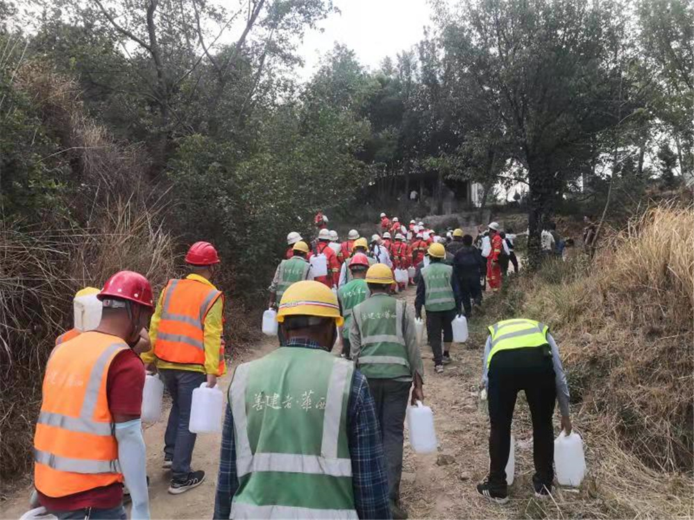 到達(dá)現(xiàn)場后,項(xiàng)目部救災(zāi)隊(duì)伍立刻與現(xiàn)場救災(zāi)指揮人員取得聯(lián)系,并聽從統(tǒng)一指揮配合進(jìn)行救災(zāi)工作。在救災(zāi)指揮人員的安排下,項(xiàng)目部救災(zāi)隊(duì)伍主要負(fù)責(zé)協(xié)助消防隊(duì)運(yùn)送救災(zāi)物資,由于森林大火火勢燃燒強(qiáng)度大,且通往火災(zāi)現(xiàn)場的道路崎嶇陡峭,車輛及消防設(shè)備無法通行,只能步行運(yùn)送救災(zāi)物資前往滅火點(diǎn)。形勢危急,刻不容緩!20斤重的水桶,2公里多的山路,項(xiàng)目部救災(zāi)人員每人拎起兩大桶水全力往返于物資供應(yīng)點(diǎn)與滅火點(diǎn)之間。在崎嶇陡峭的山路上,大家相互鼓舞,全速前進(jìn),黨員干部更是沖鋒在前、勇?lián)姑?,為肩上的那份?zé)任與擔(dān)當(dāng)負(fù)重前行。接近火區(qū)時(shí),山坡上一片雜草叢生,已無前進(jìn)道路,消防隊(duì)員沖在最前面,在荊棘叢生的山坡上緊貼草皮匍匐前進(jìn),開辟出一條臨時(shí)道路,項(xiàng)目部救災(zāi)隊(duì)伍緊隨其后,為消防隊(duì)員的滅火工作提供了強(qiáng)有力的支援。