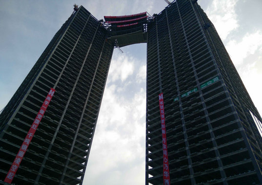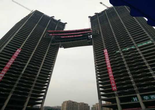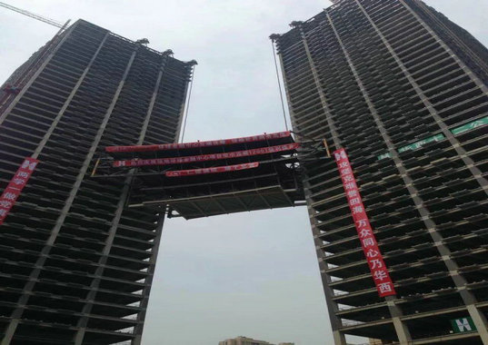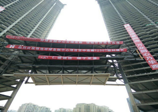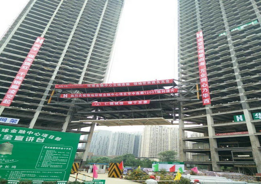 歷時三天,6月2日下午5點30分,領(lǐng)地環(huán)球金融中心千噸連廊順利登頂。