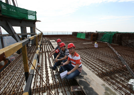 夏海濤:“作為負(fù)責(zé)連廊施工的責(zé)任工長(zhǎng),我親眼見證了連廊從底層鋼架焊接到中間梁、板的拼裝再到每一顆螺栓連接,最后成功地提升到頂層的全過程??吹阶约簠⑴c的工程能夠受到外界這么大的關(guān)注,我感覺很自豪。作為一名青年員工,我覺得自己付出的努力是值得的。在連廊沒有提升之前有很多的擔(dān)心,但當(dāng)它離地的那一瞬間,說明我們做到了,心情一下就釋懷了。”