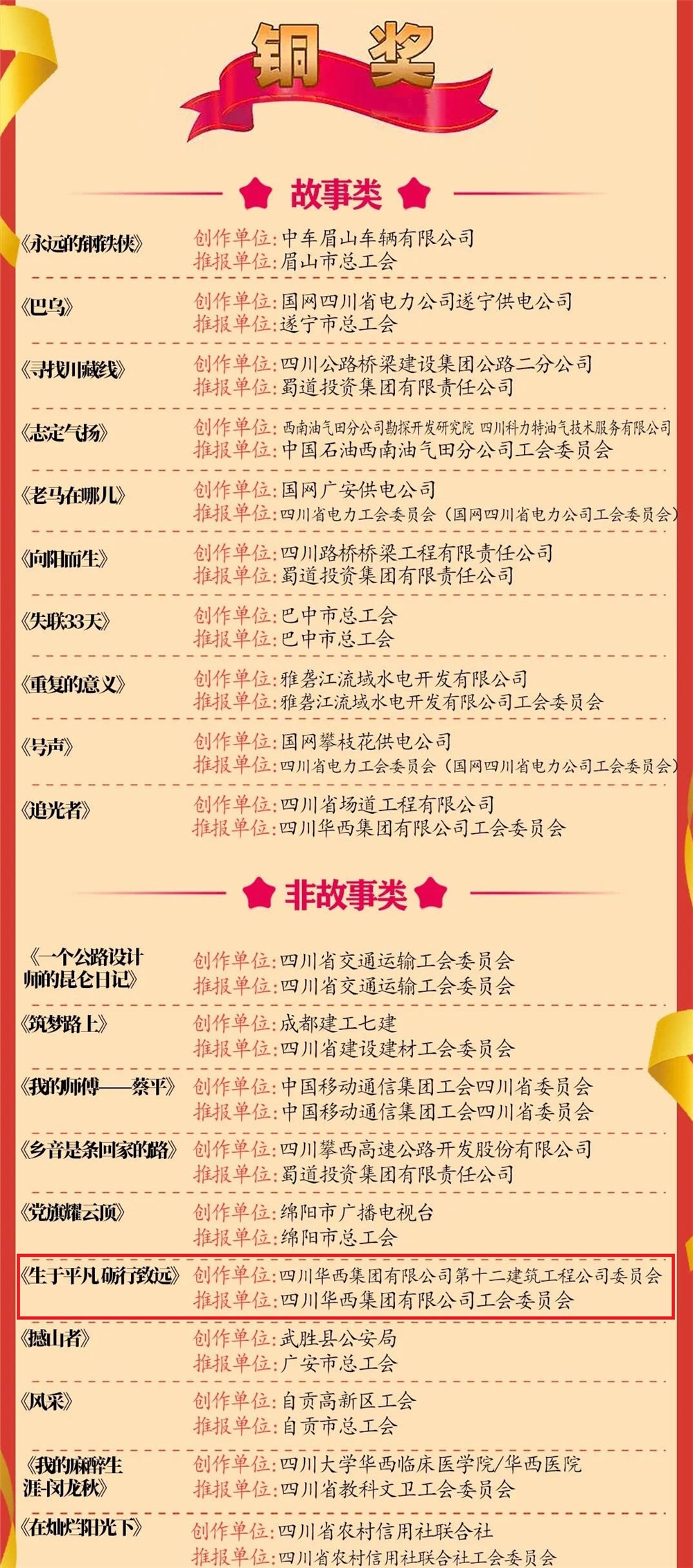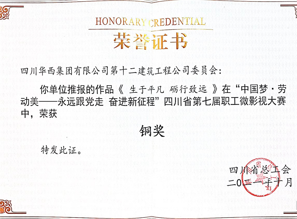 近日,由四川省總工會主辦的“中國夢·勞動(dòng)美——永遠(yuǎn)跟黨走 奮進(jìn)新征程”四川省第七屆職工微影視大賽已經(jīng)圓滿結(jié)束,公司拍攝作品《生于平凡 礪行志遠(yuǎn)》榮獲本屆大賽非故事類銅獎(jiǎng),這是該片繼獲得集團(tuán)“百年初心 奮進(jìn)華西”微電影大賽二等獎(jiǎng)后獲得的又一殊榮。