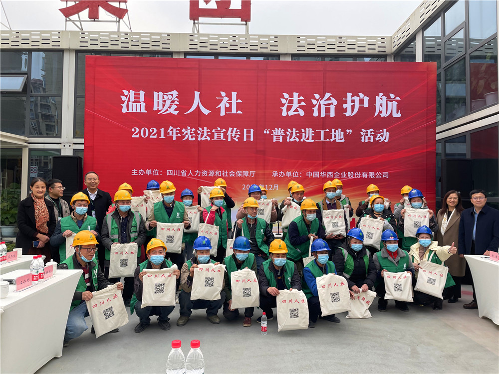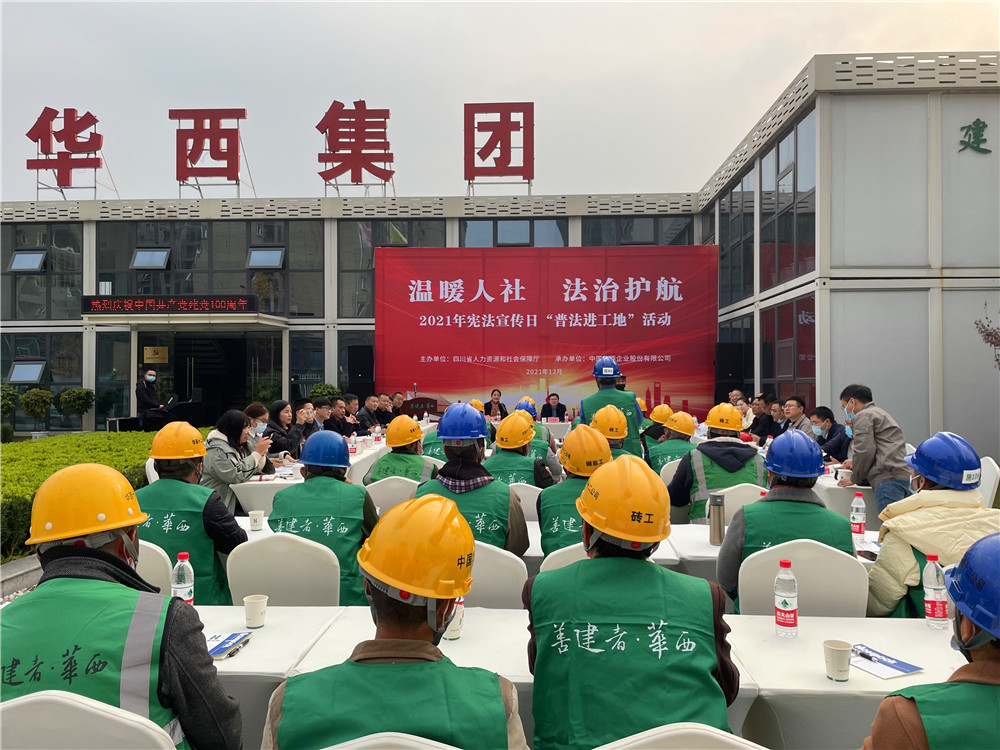 在“全國(guó)憲法宣傳日”來(lái)臨之際,為進(jìn)一步增強(qiáng)建筑領(lǐng)域用人單位和職工知法守法用法意識(shí),營(yíng)造關(guān)心關(guān)愛(ài)農(nóng)民工的良好社會(huì)氛圍,保障廣大職工個(gè)人權(quán)益,12月3日下午,由四川省人力資源和社會(huì)保障廳主辦,中國(guó)華西企業(yè)股份有限公司承辦的“溫暖人社 法治護(hù)航”2021年“普法進(jìn)工地”活動(dòng)在叢樹(shù)新型社區(qū)項(xiàng)目和玉景苑項(xiàng)目舉行。省人社廳黨組成員、機(jī)關(guān)黨委書(shū)記熊義棚,集團(tuán)黨委副書(shū)記、董事鐘曉,十二公司黨委書(shū)記、執(zhí)行董事范曉晉及相關(guān)部門負(fù)責(zé)人,以及農(nóng)民工代表共計(jì)50余人參加活動(dòng)。