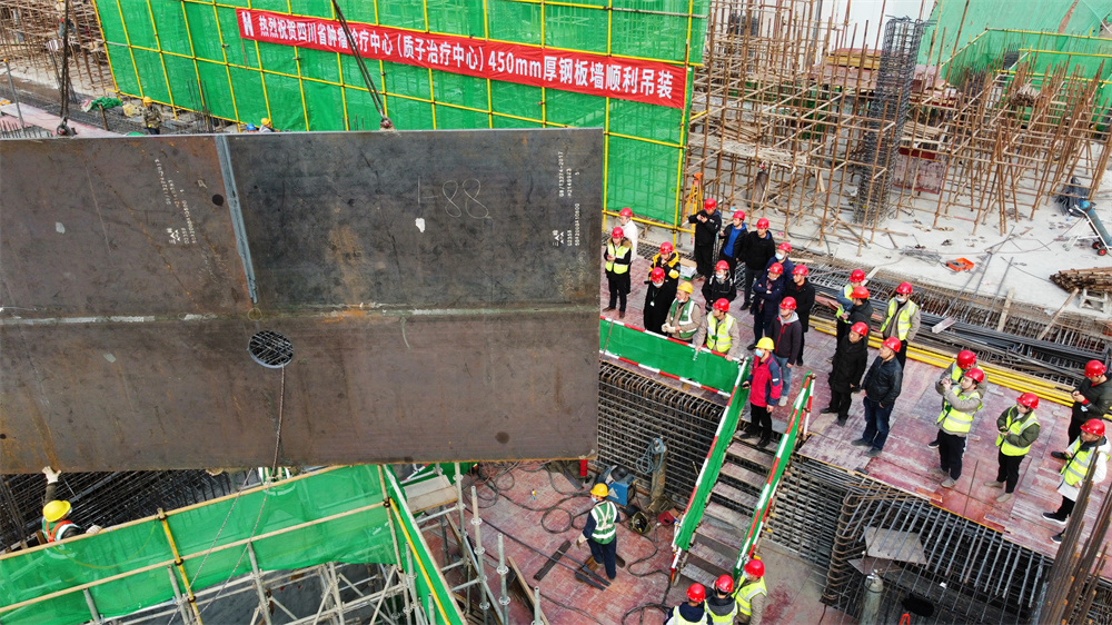 四川省腫瘤診療中心質(zhì)子中心項目是西南三省一市一區(qū)首家在建質(zhì)子中心項目,因其涉及放射性靶向治療,所以結(jié)構(gòu)設(shè)計復雜,施工工藝繁瑣,施工難度巨大。出于防輻射功能考慮,經(jīng)設(shè)計單位反復論證,最終確定質(zhì)子治療區(qū)內(nèi)的一間旋轉(zhuǎn)機架治療室剪力墻內(nèi)需安裝450mm厚(由9張50mm厚鋼板疊合,單張重量約11噸)、7050mm長、3950mm高的鋼板,而這一道施工工藝堪稱整個項目建設(shè)的“心脈”。隨著醫(yī)療建筑評價標準日趨嚴格,所需防輻射措施也日趨精細,但是對于大部分醫(yī)療建筑施工工藝來說,在墻體中嵌入鋼板防輻射的做法并不常見,而此次在質(zhì)子治療區(qū)超厚墻體中嵌入450mm厚近100噸重鋼板的做法更是絕無僅有的。如何安全精準的將鋼板嵌入墻體?這不僅是擺在大家面前最關(guān)鍵的技術(shù)難點,也是一塊懸在所有參建人員心中的的巨石,即使他們?yōu)檫@次吊裝反復修改了十余版方案,準備了半年之久,但不到最后吊裝成功,這塊石頭就始終無法安全落地。
