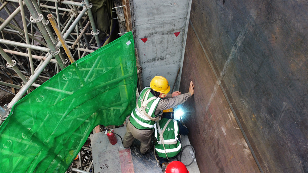 四川省腫瘤診療中心項目的建設(shè)團隊是有著光輝奮斗歷程的,他們曾建設(shè)的領(lǐng)地環(huán)球金融中心項目憑借2016年的鋼結(jié)構(gòu)連廊整體吊裝一舉奪得“中國鋼結(jié)構(gòu)金獎”。作為公司為數(shù)不多的“魯班獎”獲獎團隊,它曾有的組織體系及技術(shù)力量都在這里得到了延續(xù)和發(fā)展。為了集中力量突破此次鋼結(jié)構(gòu)大型防輻射墻板吊裝這一技術(shù)難關(guān),自2021年8月3日起,由公司、一分公司、設(shè)備及周材租賃公司相關(guān)技術(shù)人員共同組成技術(shù)攻關(guān)小組,開始反復對此次鋼板墻的吊裝方案進行討論優(yōu)化。原設(shè)計圖紙組成鋼板墻的九塊鋼板每塊由六塊小鋼板焊接而成,鋼板材料損耗極大,且焊縫較多不利于質(zhì)量控制,現(xiàn)場焊接作業(yè)后進行吊裝需要花費極大的時間,如何進行圖紙優(yōu)化?施工現(xiàn)場條件有限,如何保證每塊鋼板的焊接成型質(zhì)量,如何控制焊接過程中的形變?如何保證每塊鋼板焊縫錯開達到防輻射要求?針對上述難題,攻關(guān)小組對癥下藥,不斷設(shè)計推敲、模擬推演,經(jīng)過長時間探討及論證,各小組成員達成一致,使出如下措施來應對上述難題:一是根據(jù)鋼板材料尺寸及鋼板成型尺寸,攻關(guān)小組綜合考慮決定將組成每塊鋼板的小鋼板數(shù)量由六塊減少到三塊,既減少了焊縫數(shù)量又保證了鋼板材料的充分利用減小損耗。二是現(xiàn)場焊接受制于環(huán)境條件難以滿足質(zhì)量要求,且工期較長影響后續(xù)工序施工,小組討論決定,鋼板在工廠預制生產(chǎn),拼接處焊接采用坡口熔透焊以保證鋼板質(zhì)量,與主體結(jié)構(gòu)同步生產(chǎn)以節(jié)省工期,整個工序施工時間可由10天縮減為1天。但隨之而來的問題是每塊鋼板需要整體吊裝吊重近11噸,且施工場地狹窄,無法在場內(nèi)完成吊運,需將汽車吊布置在市政道路上,起吊點距離作業(yè)點水平距離將會達到40余米。攻關(guān)小組反復論證汽車吊選型及市政道路承載力,并結(jié)合市政道路綜合管網(wǎng)圖紙避開市政管網(wǎng),選取最佳吊車布設(shè)區(qū)域,最終確定采用300噸汽車吊布設(shè)在市政道路上作業(yè)以滿足本次吊裝工作。三是充分利用BIM技術(shù),在模型中對九塊鋼板進行預拼裝,直觀體現(xiàn)焊縫位置,保證各鋼板間焊縫全部錯開,達到防輻射要求。