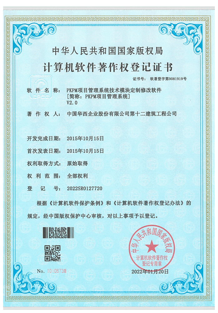 自2021年10月份以來,為配合天府國際機場T2航站樓工程申報國家科技進步獎,在公司黨委和領(lǐng)導班子的安排部署下,公司副總經(jīng)理、總工程師謝勇牽頭公司科信部,緊密聯(lián)系集團科技數(shù)字化中心和申報代理單位,按照軟著申報的規(guī)范要求制作PKPM項目管理系統(tǒng)技術(shù)模塊定制修改軟件的申報資料、操作手冊和軟件代碼庫。經(jīng)過近一個月的反復資料修改,2021年12月上旬通過初審正式提交國家版權(quán)局審核,并于2022年1月20日通過國家版權(quán)局審核,順利獲得計算機軟件著作權(quán)證書。這是公司取得的第一個計算機軟件著作權(quán)證書,為下一步在項目管理系統(tǒng)定制化修改和天府國際機場T2航站樓工程申報國家級獎項等工作打下了堅實的基礎。