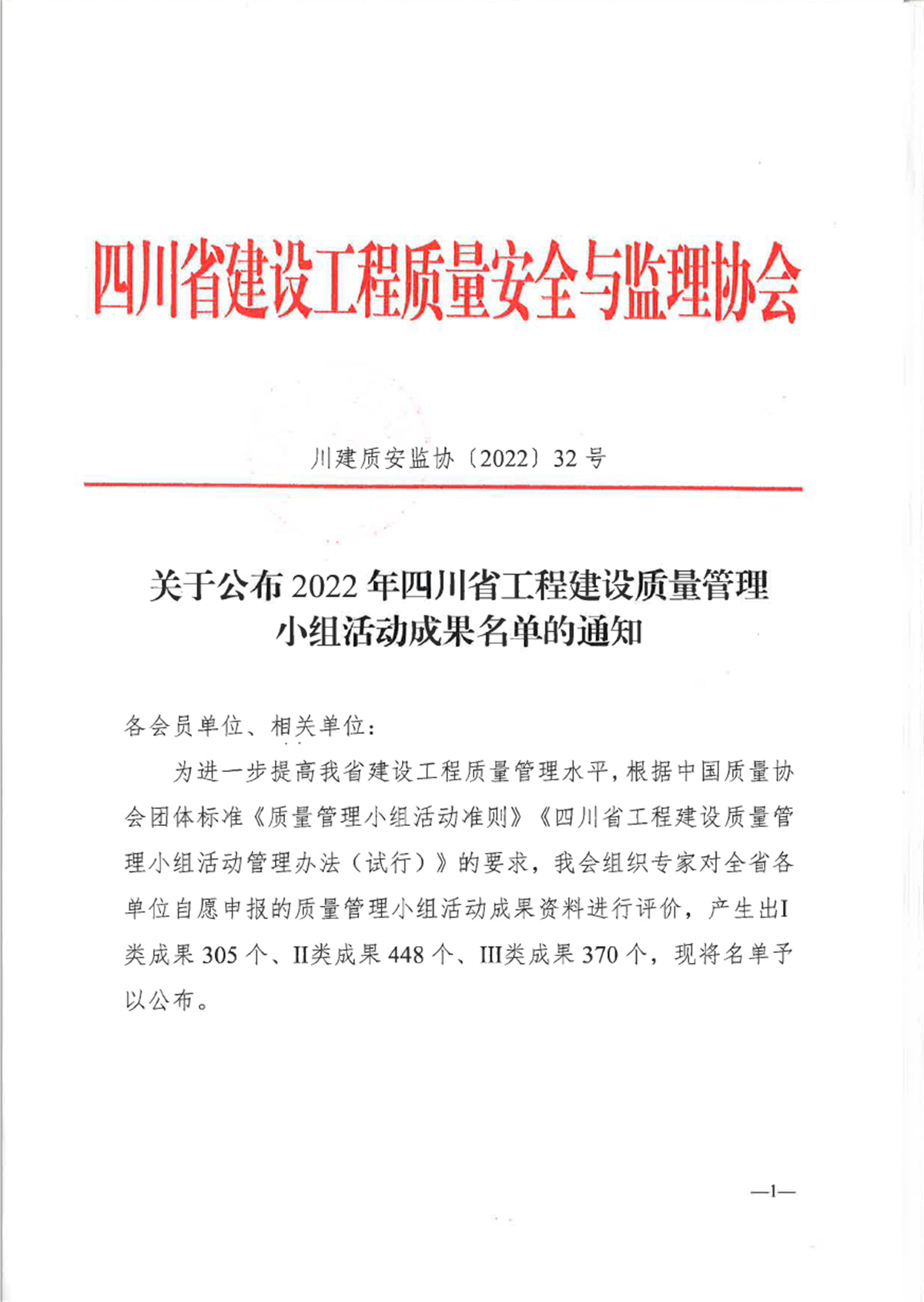 有志者事竟成,苦心人天不負(fù)!2022年度四川省級(jí)QC小組活動(dòng)成果交流學(xué)習(xí)會(huì)傳來(lái)喜訊,由公司申報(bào)的“超厚剪力墻模板非貫穿絲桿拉結(jié)加固方式的研發(fā)”、“提高核心筒超厚剪力墻混凝土一次驗(yàn)收合格率”、“提高大跨懸挑弧形陽(yáng)臺(tái)鋼筋砼結(jié)構(gòu)一次驗(yàn)收合格率”、“提高混凝土板施工質(zhì)量一次性驗(yàn)收合格率”四個(gè)QC課題活動(dòng)成果斬獲本年度四川省I類(lèi)成果獎(jiǎng)!