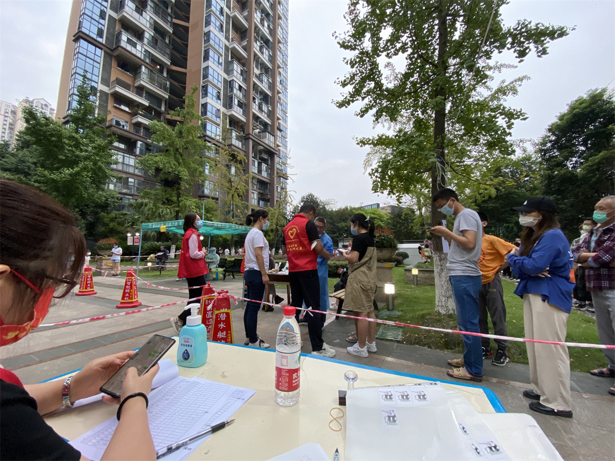 夜晚的核酸檢測(cè)點(diǎn)人影綽綽,居民有序排隊(duì)等待檢測(cè),郫筒鎮(zhèn)和平社區(qū)杜鵑公園檢測(cè)點(diǎn)忙而不亂,來自郫都一中錦繡天成黨支部的陳啟航、郭楊陽(yáng)從下午6點(diǎn)直至晚上11點(diǎn),協(xié)助引導(dǎo)前來進(jìn)行核酸檢測(cè)的群眾排隊(duì)、填報(bào)核酸信息等工作。一站就是5個(gè)小時(shí),為社區(qū)居民提供不間斷的核酸檢測(cè)服務(wù)。