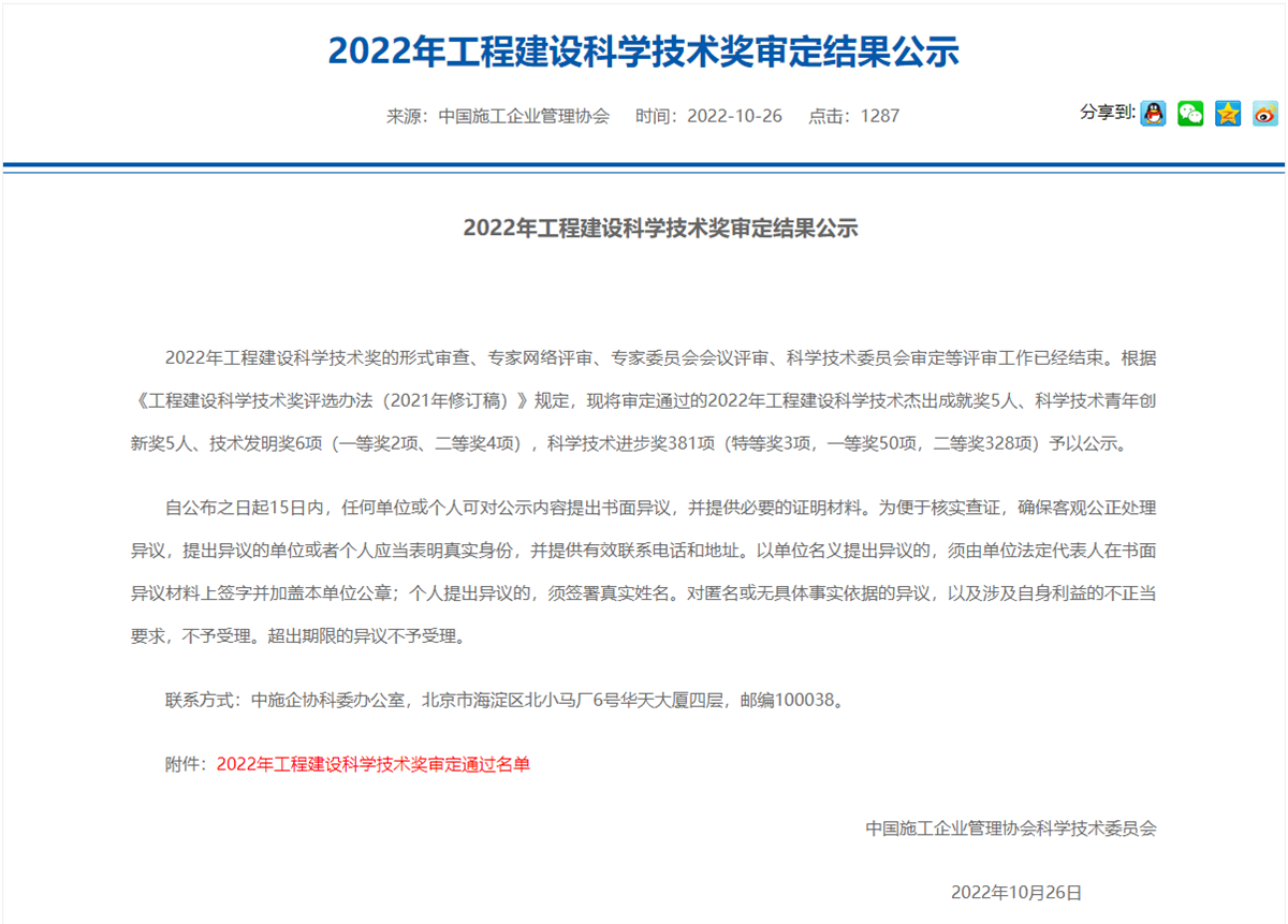科研項(xiàng)目“現(xiàn)代超大型高層冷庫建造技術(shù)研究與應(yīng)用”,經(jīng)過推薦、申報(bào)、形式審查、專家網(wǎng)絡(luò)評(píng)審、專家委員會(huì)會(huì)議評(píng)審、科學(xué)技術(shù)委員會(huì)審定、審定結(jié)果公示等程序,斬獲2022年中施企協(xié)科技進(jìn)步二等獎(jiǎng)。同時(shí),項(xiàng)目組應(yīng)邀參加12月初舉辦的中施企協(xié)科創(chuàng)大會(huì)優(yōu)秀科技成果交流活動(dòng),進(jìn)行線上發(fā)布交流。