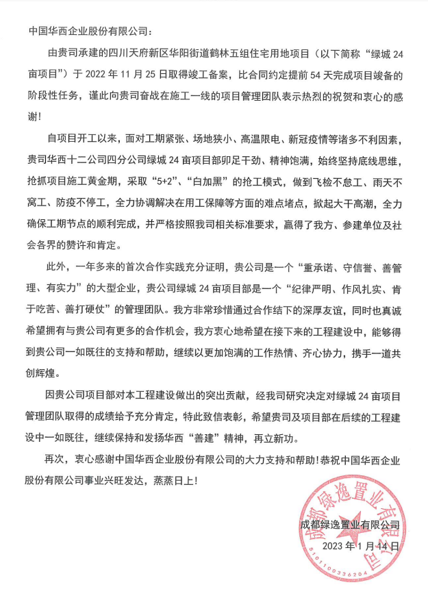 新年伊始,由公司承建的四川天府新區(qū)華陽街道鶴林五組住宅用地項(xiàng)目收到來自建設(shè)單位成都綠逸置業(yè)有限公司的表彰信,信中充分肯定了項(xiàng)目進(jìn)場以來的施工情況,對(duì)華西積極配合完成節(jié)點(diǎn)目標(biāo)表示衷心感謝,對(duì)項(xiàng)目團(tuán)隊(duì)高效務(wù)實(shí)的工作作風(fēng)表示高度認(rèn)可。