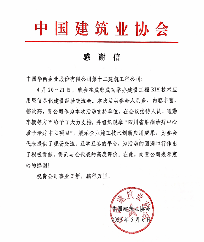 5月6日,中國(guó)建筑業(yè)協(xié)會(huì)向華西十二公司發(fā)來(lái)感謝信,感謝公司為保障建設(shè)工程BIM技術(shù)應(yīng)用暨信息化建設(shè)經(jīng)驗(yàn)交流會(huì)的順利召開(kāi)而做出的積極貢獻(xiàn)。