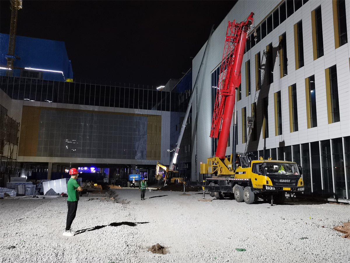 時(shí)針已指向23點(diǎn)整,身著綠T、左胸口印著大大的刺繡H標(biāo)志、頭頂紅色安全帽的小伙子還在燈火通明的施工現(xiàn)場(chǎng)忙碌著,指揮著現(xiàn)場(chǎng)的三臺(tái)隨車吊將地面的種植土運(yùn)上裙樓頂層花園。裙樓的另外一側(cè)則是工人們忙碌的身影,開著小型三輪運(yùn)貨車將底層的砂石料運(yùn)往塔樓,一車又一車,一趟又一趟,為樓面的基層和面層的施工任務(wù)奠定物料基礎(chǔ)......