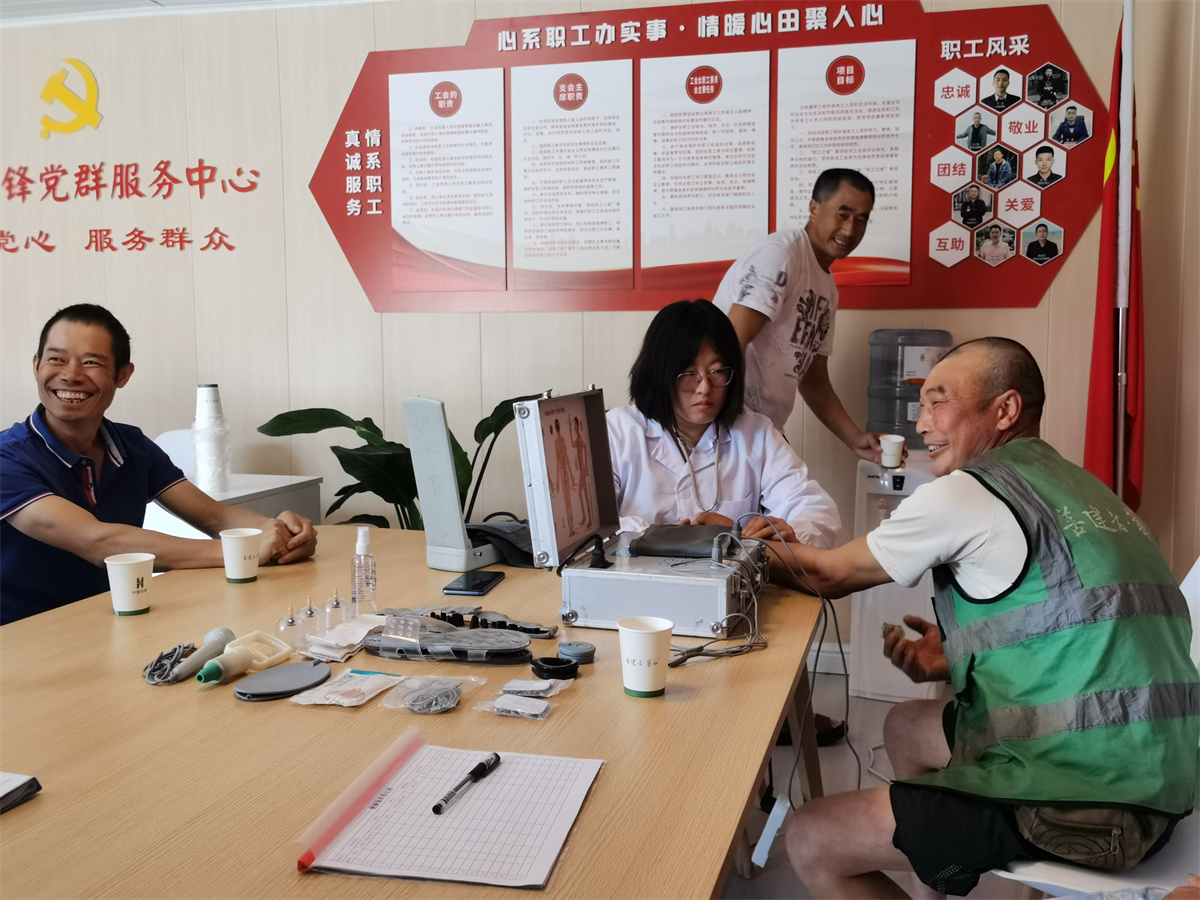 為了保障廣大工友的身體健康,善建先鋒黨群服務(wù)中心特邀專業(yè)診療師前來(lái)開(kāi)展中醫(yī)診療活動(dòng)?;顒?dòng)現(xiàn)場(chǎng),診療師通過(guò)把脈,結(jié)合“望、聞、問(wèn)、切”方式,耐心分析工友們的身體狀況,根據(jù)大家各自的身體情況提出合理的診療建議和健康指導(dǎo)。針對(duì)建筑工人易發(fā)的頸椎病、腰痛、坐骨神經(jīng)痛等職業(yè)病,診療師通過(guò)針灸、推拿、拔罐、紅外線熱敷等方式為大家緩解病情,幫助工友查找病源、理清病因,同時(shí)為大家講解施工現(xiàn)場(chǎng)常見(jiàn)的亞健康疾病理療和健康保健知識(shí),增強(qiáng)了工友預(yù)防疾病和自我保健的能力。