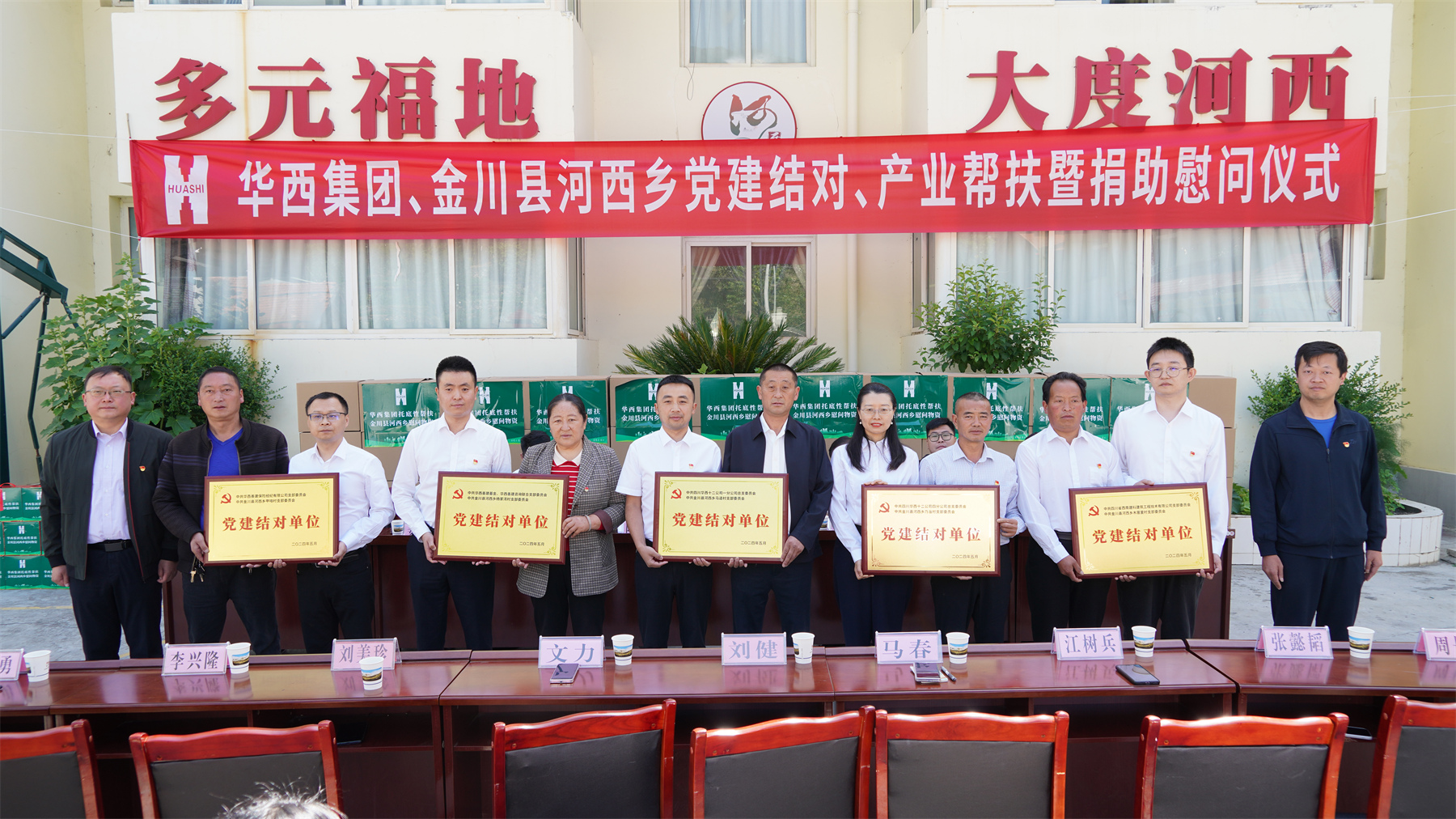 活動現(xiàn)場,華西集團幫扶一組與河西鄉(xiāng)人民政府簽訂了《華西集團托底性幫扶金川縣河西鄉(xiāng)振興發(fā)展框架協(xié)議書》,選派基層黨組織分別與河西鄉(xiāng)5個村支部進行了黨建結(jié)對授牌儀式,舉行了助學(xué)圓夢計劃授牌儀式,為河西鄉(xiāng)捐贈了一批幫扶物資,對河西鄉(xiāng)6名困難黨員和34名困難群眾進行了幫扶慰問。華西集團幫扶一組駐河西鄉(xiāng)幫扶干部王德剛作了表態(tài)發(fā)言。河西鄉(xiāng)向華西集團贈送了錦旗。陶丹和賀巍分別代表金川縣委縣政府、省國資委對華西集團對托底性幫扶工作的支持和付出表示了感謝和肯定。