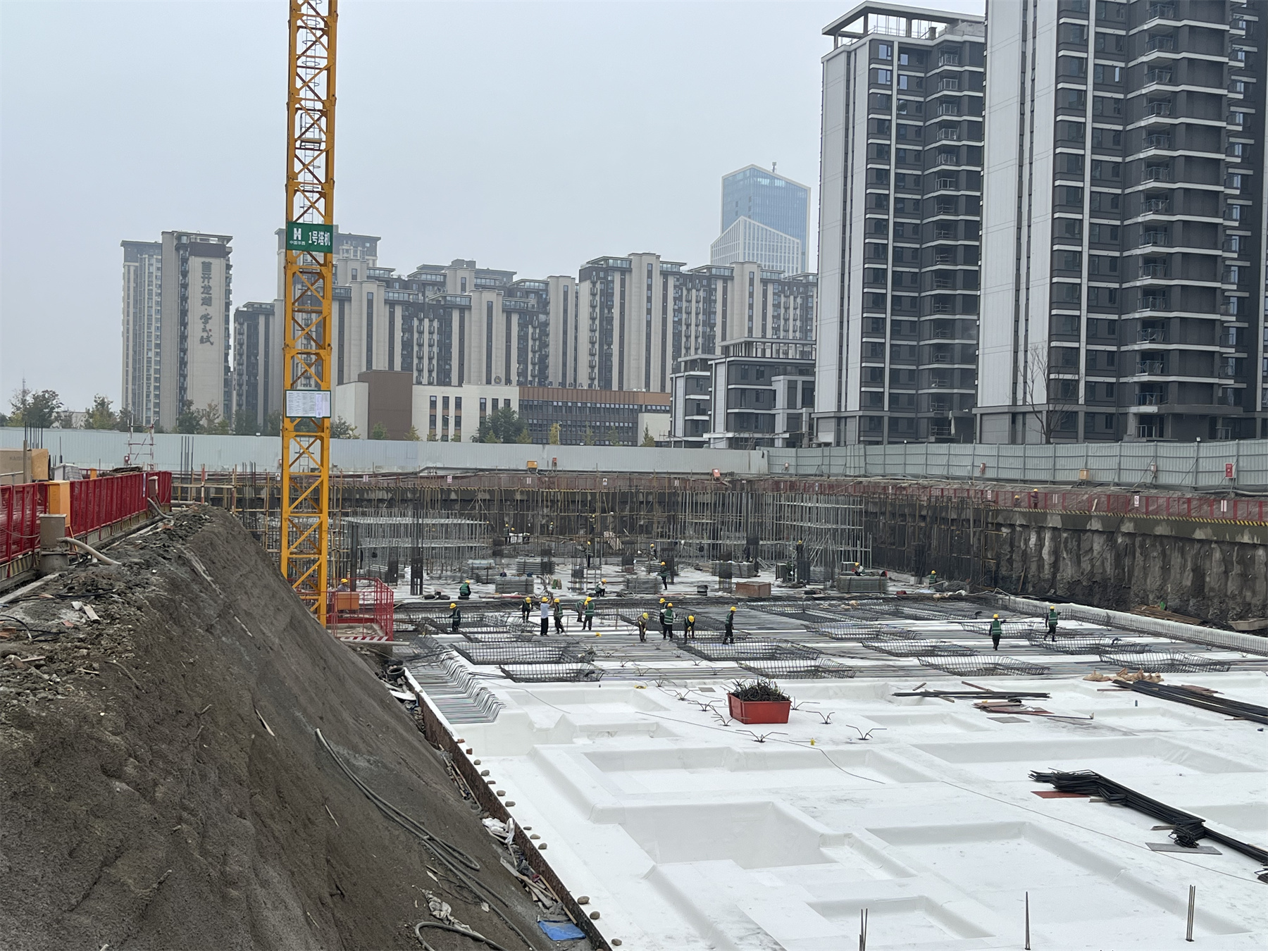 項目目前正處在地下室施工階段,每天現(xiàn)場管理人員和工人共計160余人,吊車、運輸車輛等大型施工機械配備充足,建設(shè)正按照目標進度推進。截至目前,地下室整體已完成50%。A區(qū)地下室頂板(梁板支模完成)墻筋綁扎50%,柱筋70%;B區(qū)地下室頂板(梁板支模完成)、獨基支模架搭設(shè)完成、抗水板砼已澆筑。C區(qū)地下室抗水板已澆筑。D區(qū)抗水板底板筋綁扎完成80%,獨基基礎(chǔ)開挖完成面積60%。
