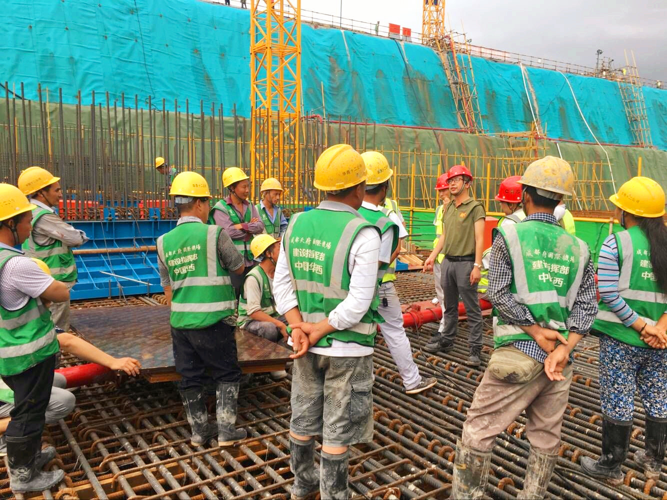 與此同時,在大鐵首段達到澆筑條件前,項目總工、技術負責人多次到現(xiàn)場做技術指導,解決了多個技術難點。面對暗梁大規(guī)格直徑40mm的三級鋼筋密集穿越多根抗拔樁,造成樁鋼筋與梁鋼筋沖突無法穿越,項目部與設計院多次對接,商討鋼筋優(yōu)化方案;對墻體腋角采用定型預制鋼模板,解決了腋角混凝土成型質量;事前確定合理的澆筑順序,以便滿足大體積混凝土技術要求。達到澆筑條件后,項目總工在首段現(xiàn)場與區(qū)段管理人員、施工班組做技術交底,強調常規(guī)的操作規(guī)程、應注意的技術難關、易于預見的突發(fā)狀況等,做到事前心中有數,遇事冷靜不慌亂。項目技術團隊從理論到指導再到技術支持準備充分,從源頭為大鐵首段混凝土的澆筑做強有力的支撐。