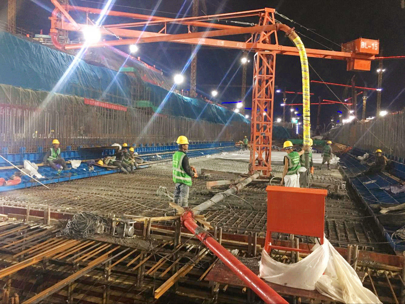 “萬事俱備只欠東風”,大鐵區(qū)管理人員和作業(yè)人員分頭行動,分別準備和檢查泵管架設、布料機、振搗棒、照明設備、養(yǎng)護材料等等,同時派專人前往商混站檢查原材料供應,從源頭確?;炷粮哔|高量的供應。20時零8分,一陣轟轟轟的聲音響徹在大鐵和C區(qū)交匯處,1號泵管正式開始運作供應混凝土。不多時緊接著2號泵管和3號泵管也開始運作,大鐵首段5個倉一片熱鬧繁忙的景象。當晚,公司總經理趙崇賢打來電話,關切詢問現(xiàn)場有關澆筑情況。