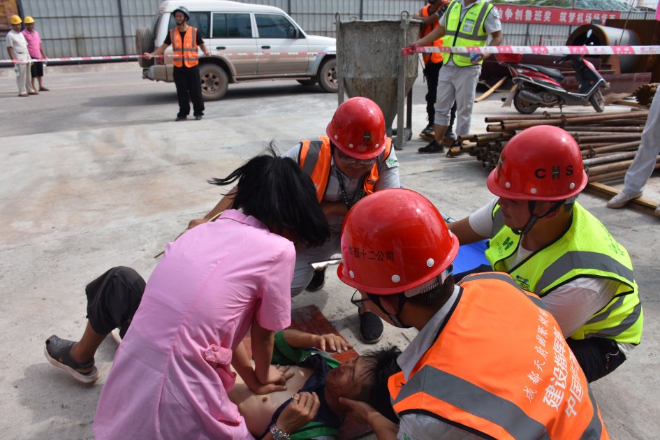 此次演練由項(xiàng)目部安全總監(jiān)張兵擔(dān)任總指揮,安全主管姚偉廣任副總指揮,項(xiàng)目管理人員和現(xiàn)場安保人員組成事故處理組、緊急聯(lián)絡(luò)組、醫(yī)療救護(hù)組和后勤保障組。經(jīng)過系列部署,應(yīng)急演練正式開始,張兵向應(yīng)急小隊(duì)發(fā)布指令,小組成員首先與保安配合封鎖周邊道路避免二次傷害,同時召集專業(yè)醫(yī)務(wù)人員到場,在他們專業(yè)指導(dǎo)下,將中暑工人抬至陰涼處進(jìn)行緊急救助,同步聯(lián)系就近醫(yī)療服務(wù)中心,送至醫(yī)院確保身體狀況。