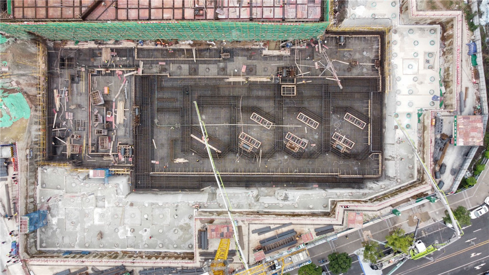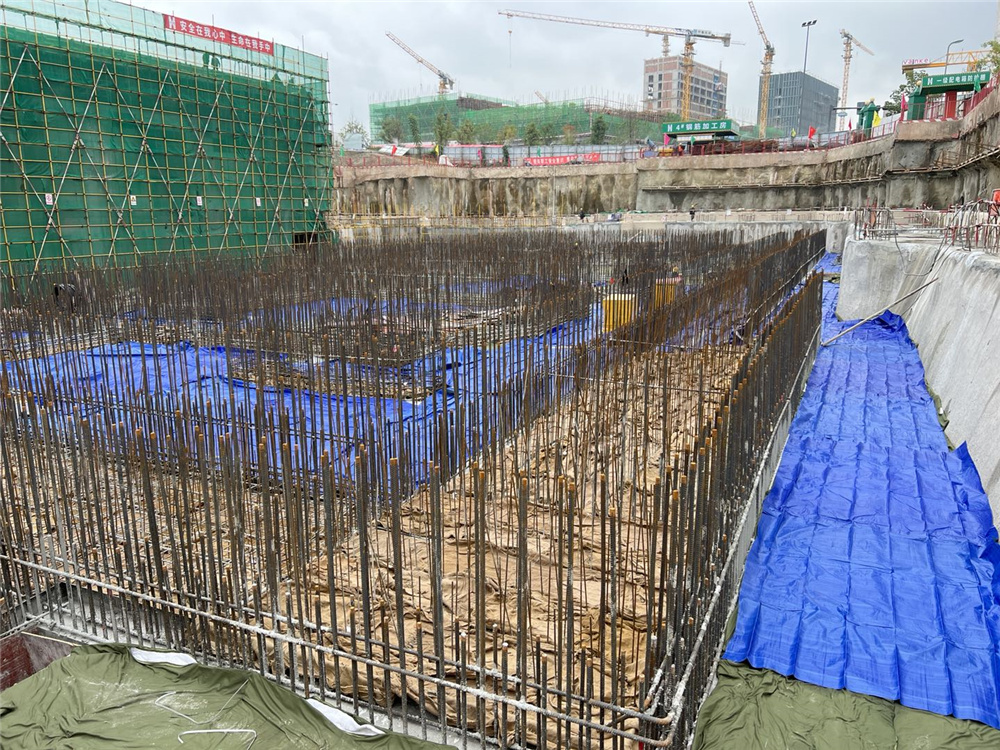 四川省腫瘤診療中心質(zhì)子治療中心的筏板澆筑施工有五個(gè)特點(diǎn)和難點(diǎn)。一是體量大,筏板約5200立方米,平均厚度1.56米;二是用鋼量大,筏板約850噸鋼筋,鋼筋間距密集,澆筑難度大;三是深度大,筏板埋深距地面約17米;四是連續(xù)施工,筏板需不間斷連續(xù)澆筑;五是混凝土防裂溫度控制要求高。